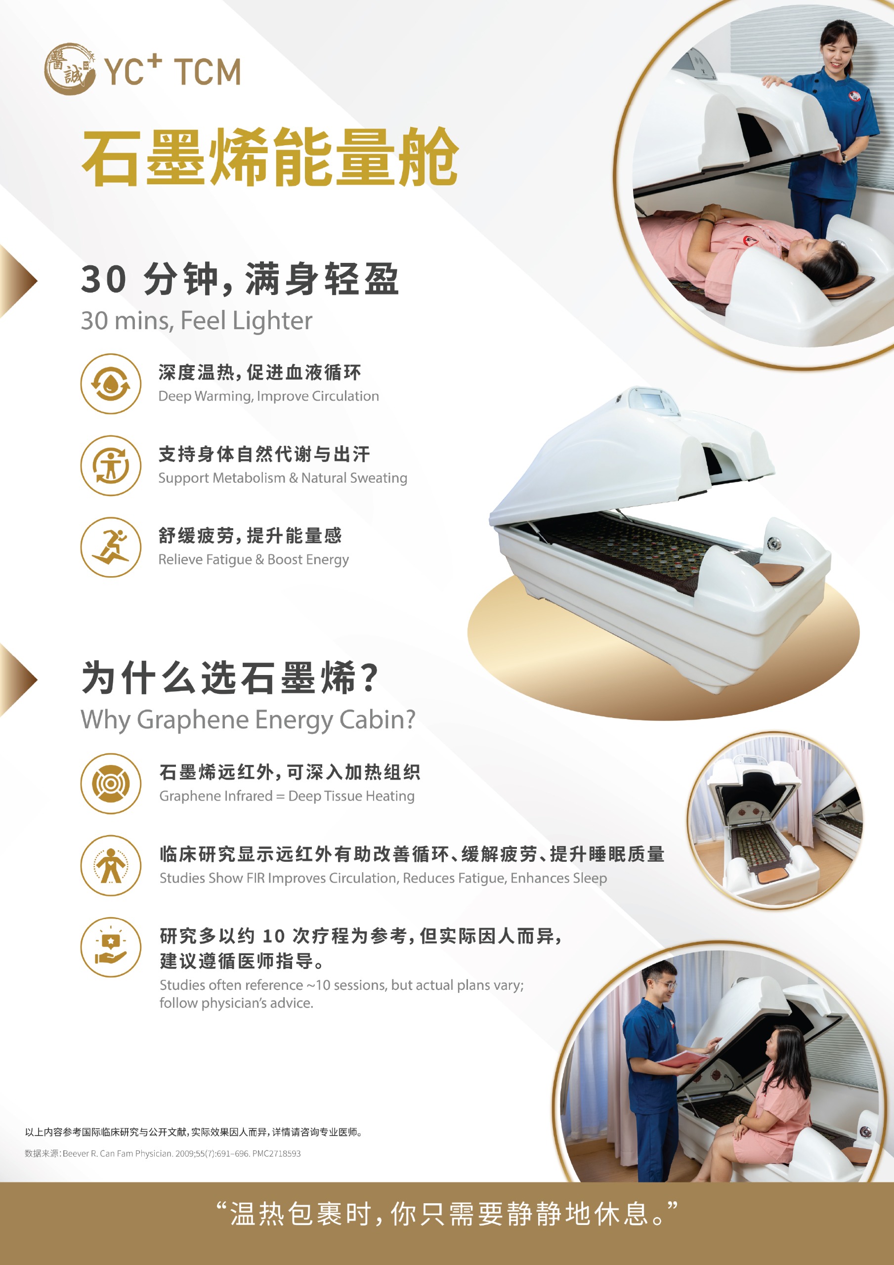 Relax, recharge, and restore. Combining graphene and far-infrared thermal technology, this capsule promotes circulation, relieves fatigue, and supports deep detoxification. (30mins, Feel Lighter)