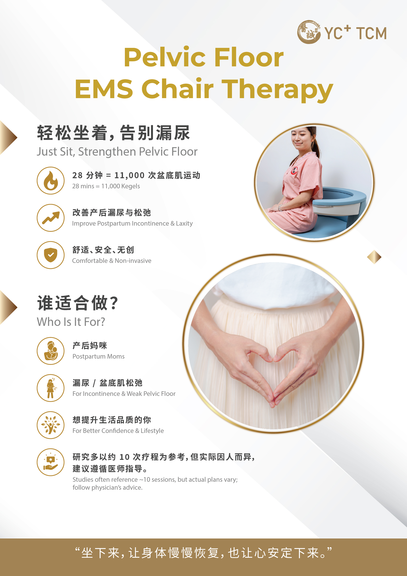 - Integrate TCM body constitution treatments with pelvic restoration techniques, assisted by the Pelvic Floor EMS Chair Therapy, to support pelvic and pelvic floor health.