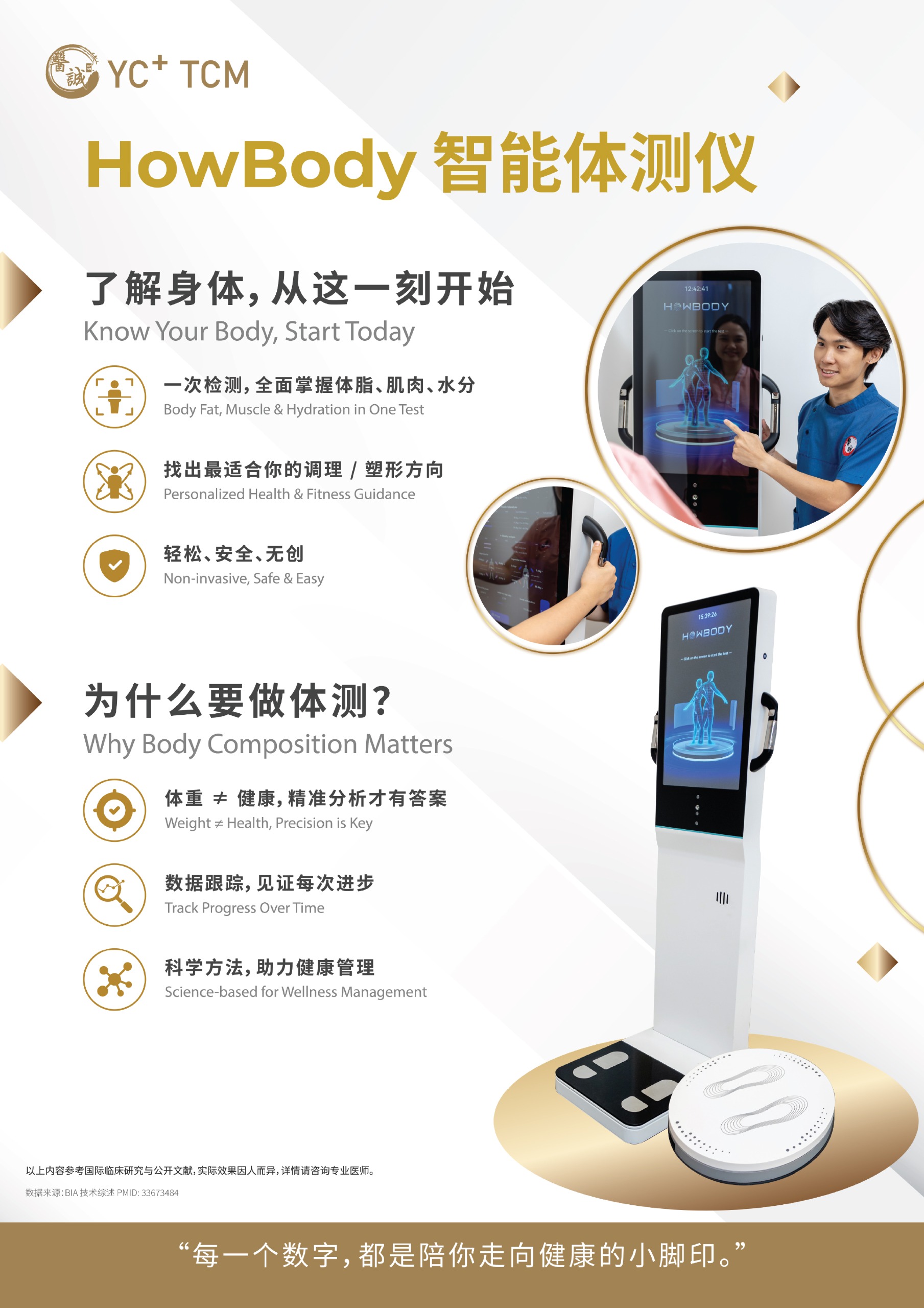 了解身体,是调理的第一步。透过先进的姿态与身体组成分析,掌握体脂、水分、肌肉比例与姿势平衡,由专业中医师为您量身制定专属调理方案。(了解身体,从这一刻开始)